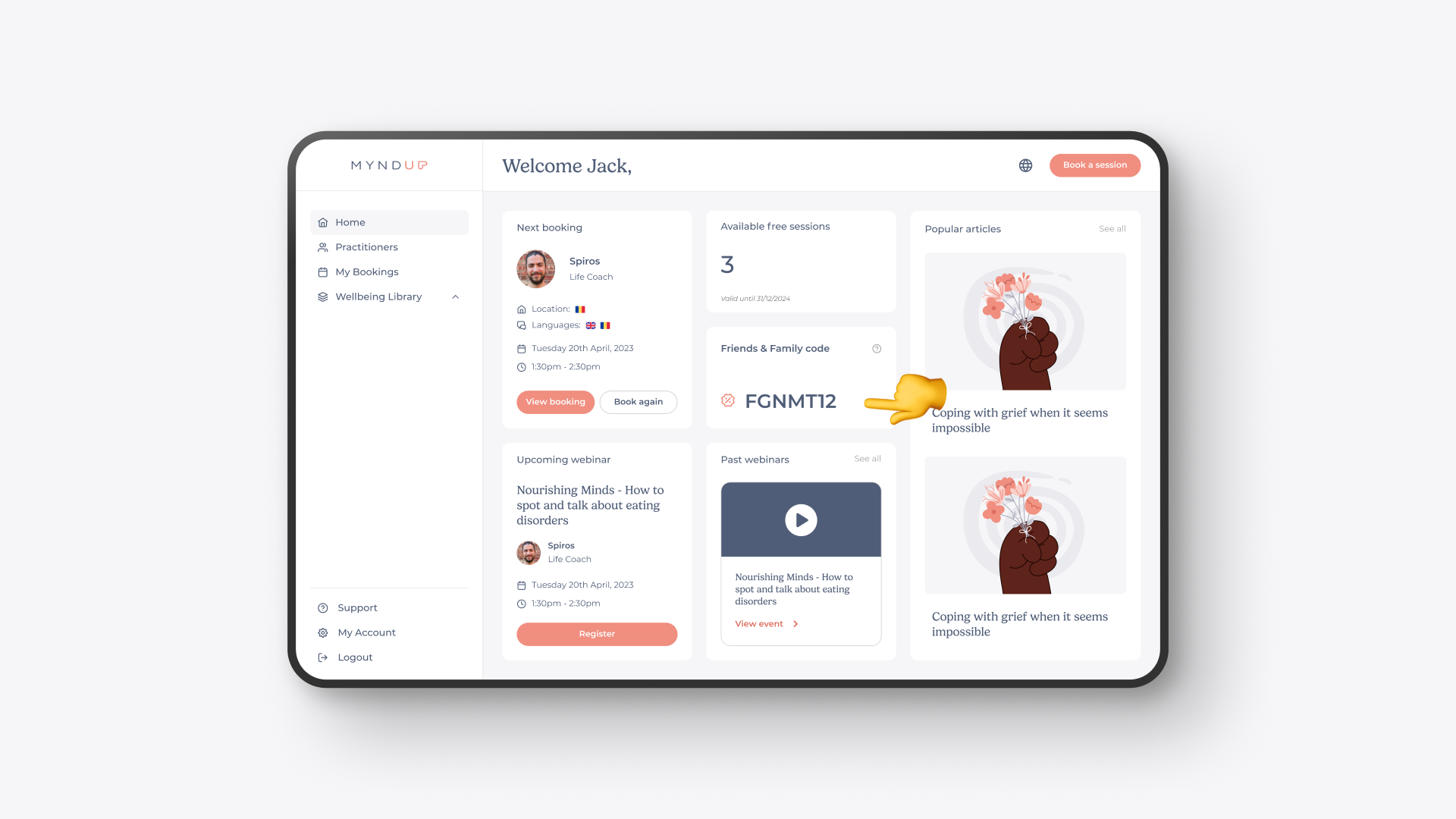 Right in the center of your home page youβll see a friends and family code. Feel free to share it and they can sign onto www.myndup.com and book a session at a discounted rate.